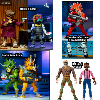 If you are a big fan of Teenage Mutant Ninja Turtles, you are going to be very happy because we have four different figure packs to offer you and they are made up of characters that we don't see often. The first includes Splinter and Baxter Stockman, the second Rat King and Vernon, the third Captain Zarax and Zork and finally the fourth and final is made up of Triceraton Infantryman and two Roadkill Rodney.