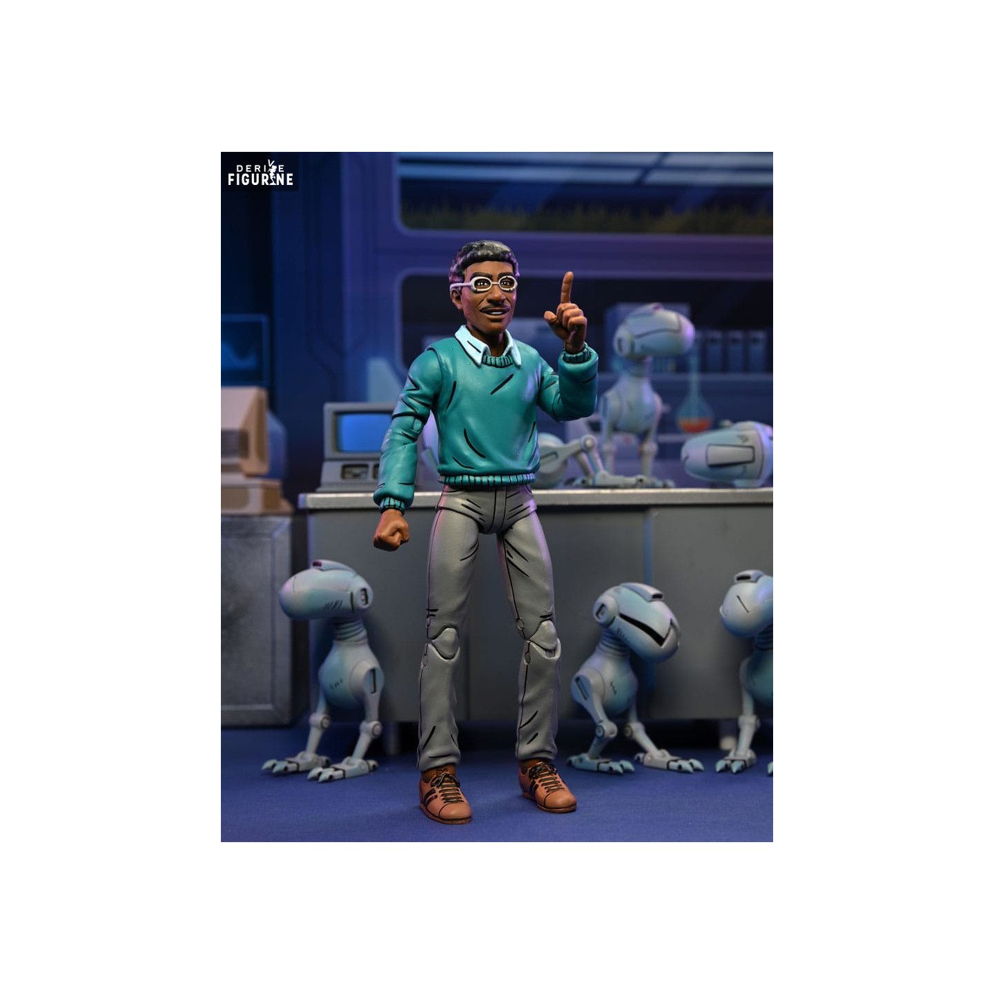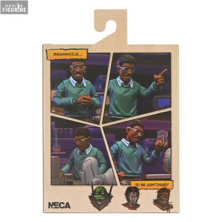 The Baxter Stockman figure is shown in a casual outfit consisting of a blue-green sweater, a light blue shirt and gray pants. His distinctive glasses and determined expression reflect his intellectual and Machiavellian character. The figure is equipped with several accessories that enrich the play and display experience.