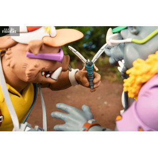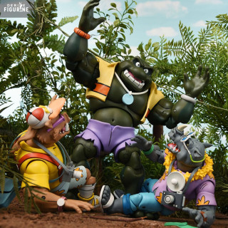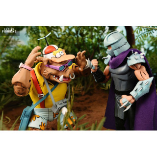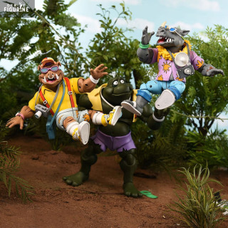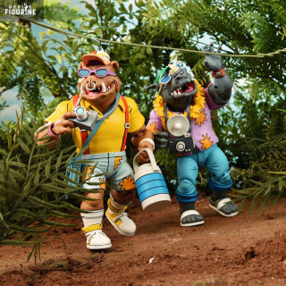 In this "Vacation" pack, Bebop and Rocksteady take on a delightfully quirky appearance, dressed for a relaxing holiday that contrasts with their usual roles as Shredder's muscle. Bebop, sporting Hawaiian shorts, a beach bag, and flashy sunglasses, looks ready to hit the waves. Rocksteady, with his vintage camera, floral shirt, and stylish hat, nails the perfect tourist vibe. These fun details bring a fresh and playful twist to these already beloved characters.