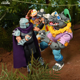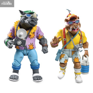 Official pack figures of Bebop and Rocksteady, Vacation which measure approximately 18 centimeters high. The manufacturer is NECA.