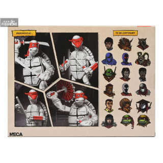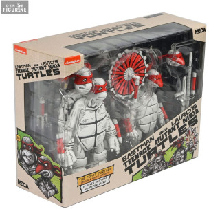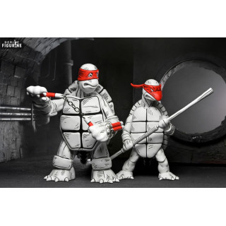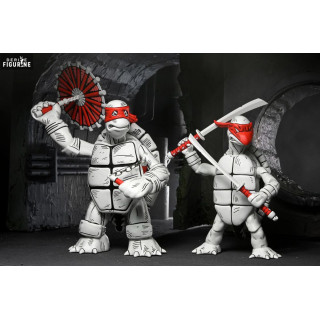 Official figures of Black and White First Turtles which measure approximately 18 centimeters high. The manufacturer is NECA.