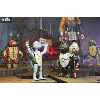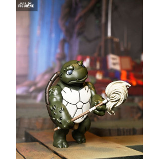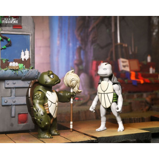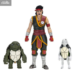 The figure depicts Casey in her signature outfit: sleeveless jacket, red headband, and reinforced gloves for delivering justice. Her determined face still bears the marks of recent battles, and her sculpted muscles reflect years of intense training. Baby Odyn sports a rugged shell armor and clenched jaws, ready to charge, while Uno stands tall and observant, with smooth plastron and piercing eyes.