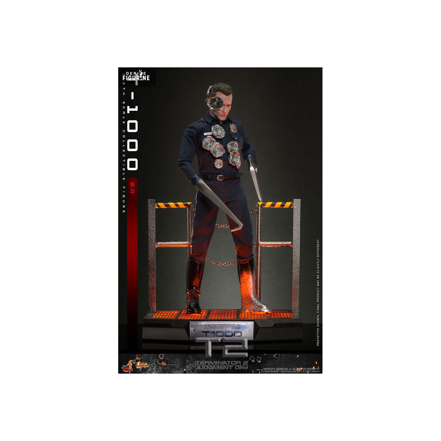 Standing approximately 31 centimeters tall and at 1/6 scale, this figure is part of Hot Toys' Movie Masterpiece collection. Every detail is meticulously crafted to honor this iconic cyborg. With three different display styles, the figure includes various liquid metal effects, weapons, and a battle-damaged face to simulate the intense battle scenes. The police uniform and armor details faithfully capture the essence of this cold, inhuman character. Additionally, the light-up base adds a spectacular touch, perfect for showcasing the T-1000 in dynamic or menacing poses.