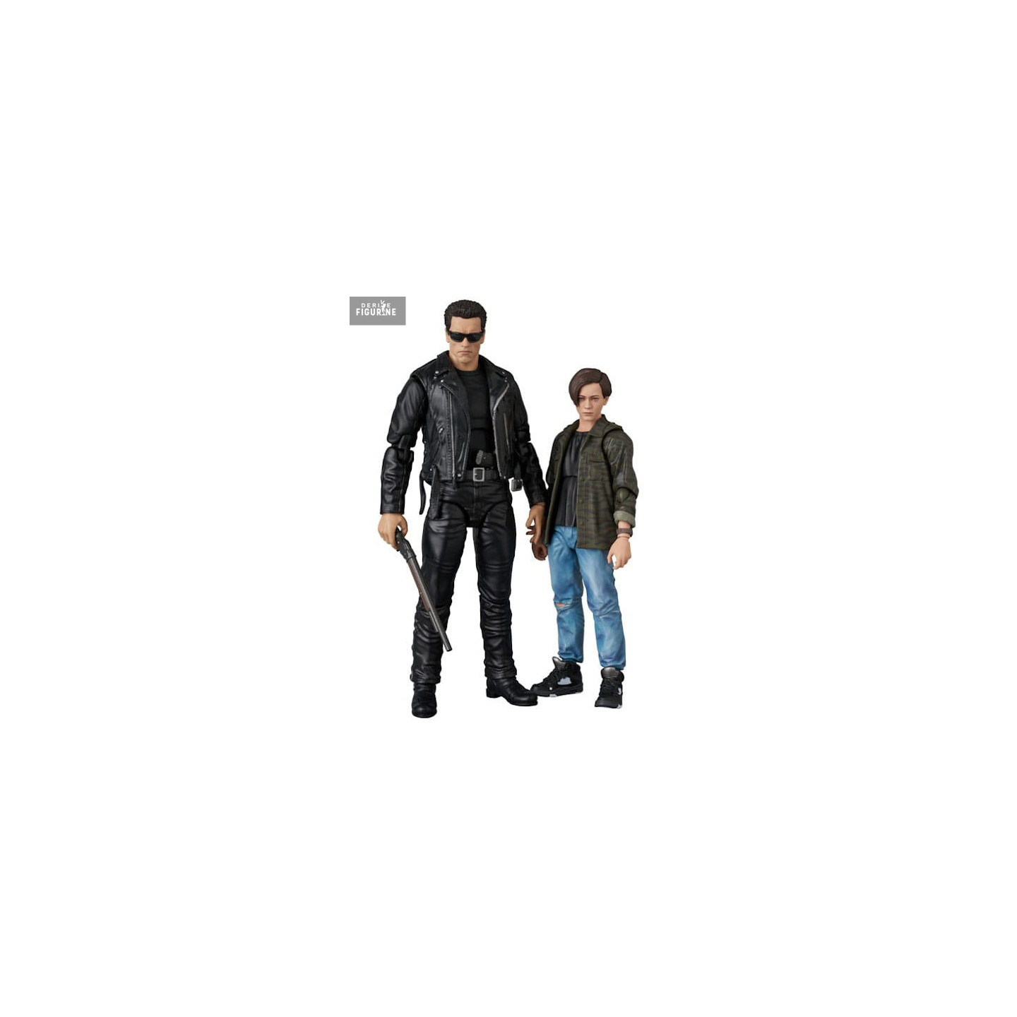 These MAFEX figures perfectly replicate the characters’ iconic look: the T-800’s battle-damaged endoskeleton peeks through its synthetic skin, and his imposing stance with shotgun showcases raw power. John wears his casual outfit—a green jacket, dark tee, and worn jeans—and his youthful features are sculpted to convey both vulnerability and bravery.