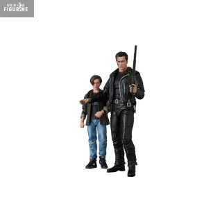 Official figures of T-800 (T2) & John Connor which measure approximately 16 centimeters high. They are from the Miracle Action Figure (MAFEX) collection. The manufacturer is Medicom Toy.