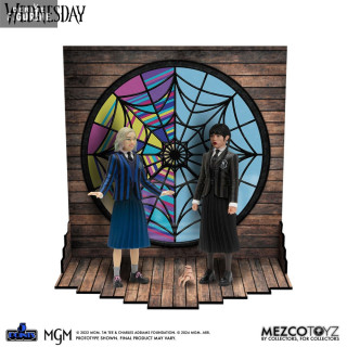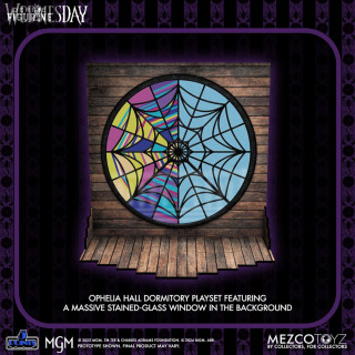 This set includes Wednesday and Enid dressed in their Nevermore Academy uniforms, as well as Wednesday's loyal servant, Thing. As a bonus, you'll find a boarding school room setting that, when assembled, features the Ophelia Hall room, with its shared dormitory and a huge stained glass window in the background.