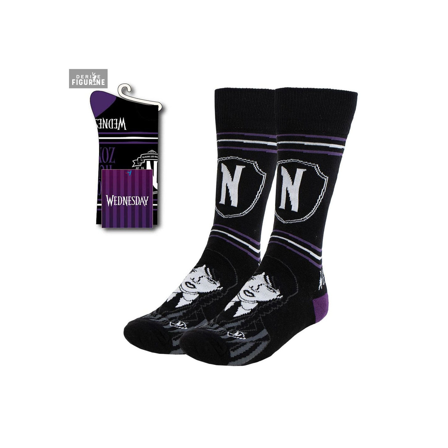 Inspired by the Wednesday series, these official socks perfectly reflect the dark and mysterious world of the heroine. On a black base, they feature purple and white stripes along with a crest marked with the letter “N,” referencing Nevermore Academy.