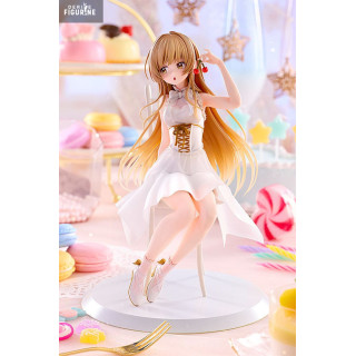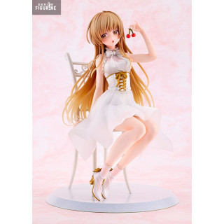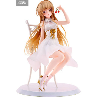 The figure faithfully captures her pristine outfit: a white babydoll-style dress cinched at the waist by delicate golden lacing and featuring a sheer, billowy skirt. Her long hair fades from light chestnut to caramel, framing a finely sculpted face with softly blushed cheeks. In her hand, two cherries add a whimsical touch, while the white sculpted chair completes the tableau.