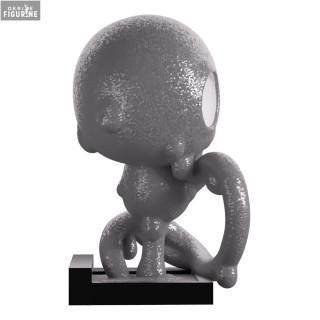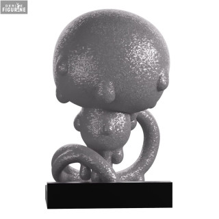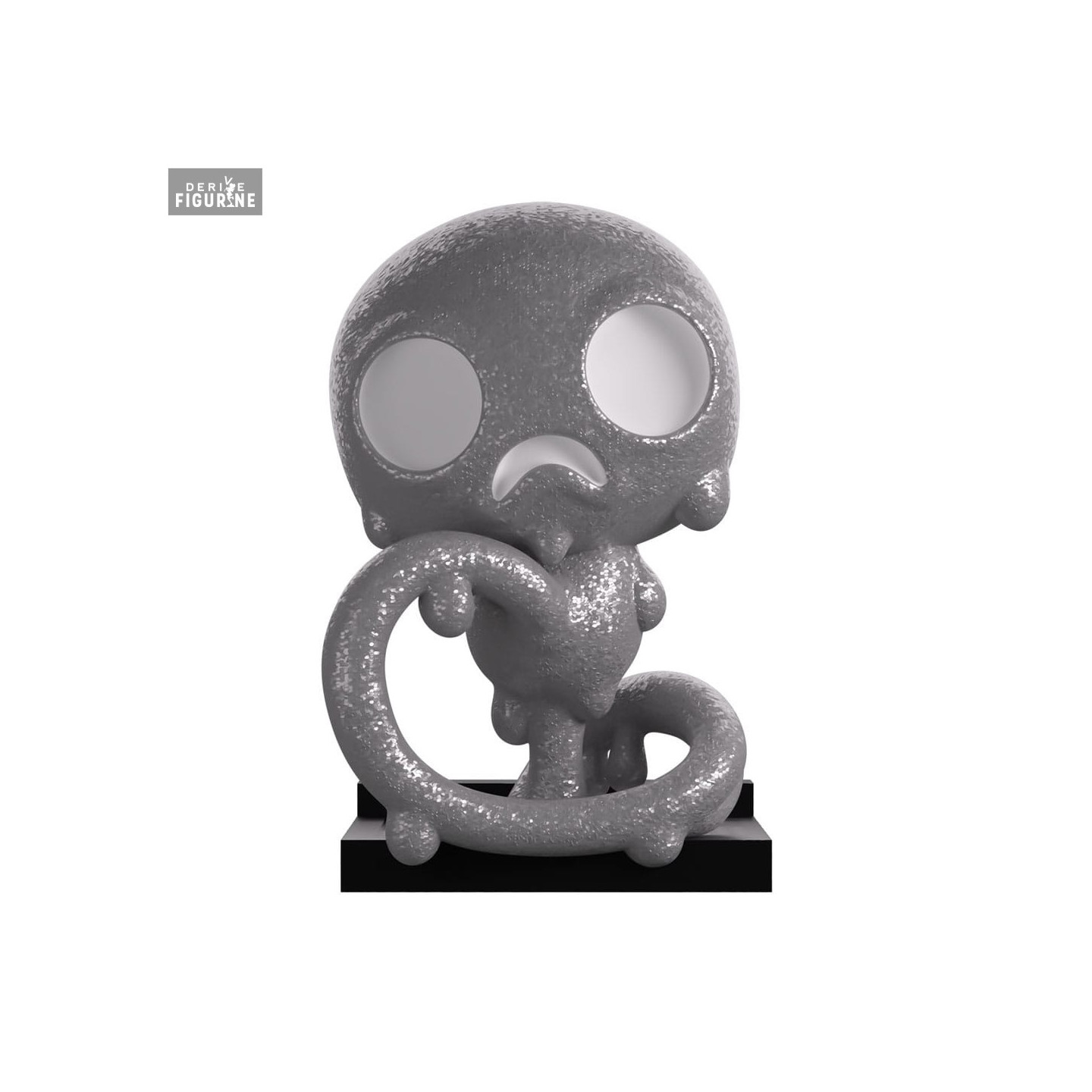 This vinyl figure faithfully recreates its appearance: an entirely silver-gray body with glittery reflections, large completely white round eyes, and a small downward-curved mouth giving it a somber look. Its curled posture, with a long tail wrapped around itself, emphasizes its enigmatic nature. The square black base ensures solid display and contrasts with the shimmering texture of the body.