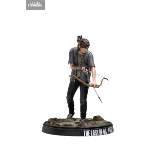 The circular base, embossed with The Last of Us Part II logo, features a ruined forest setting with rocks and twigs to ground the scene. Matte finishes on her face contrast with satin details on the quiver and bowstring, while subtle shading and weathering effects deepen the immersion in the post-pandemic brutality.