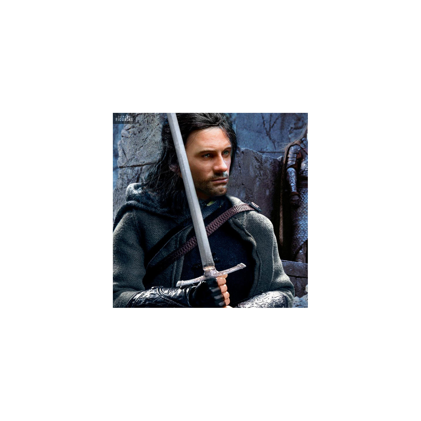 Aragorn lost his father at a very young age, when he was only two years old and was later raised by Elrond until he was twenty. This figure represents him with long hair, cloth clothes and several weapons, such as a bow and arrows.