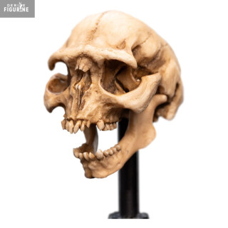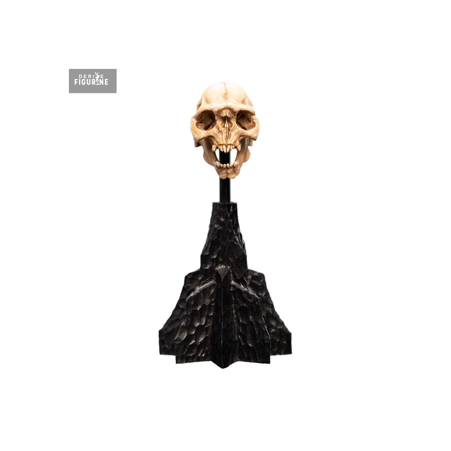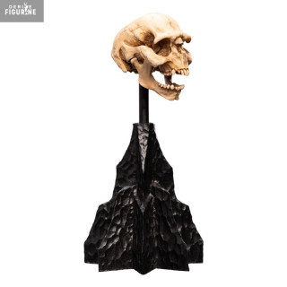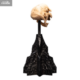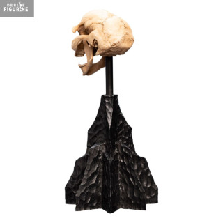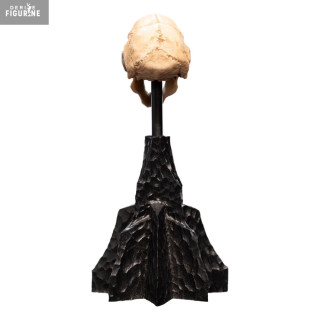 The skull is mounted on a textured black base, designed to recall the dark, rocky environments of the Moria caverns. This base adds a touch of sophistication and mystery to the whole, making this replica an impressive and striking collector's item.