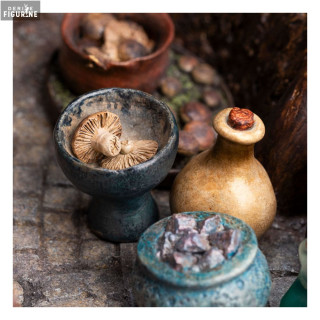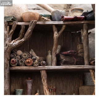 Rhosgobel, Radagast's woodland home, is depicted in all its glory, nestled deep within a dense forest. The figure shows Radagast, clad in his tattered robes, stepping out of his house surrounded by potions, books, and mysterious objects, enhancing the mystical atmosphere of this unique wizard. The attention to detail is absolutely astonishing, from the bark of the trees to the stones surrounding the wooden door of Rhosgobel, not to mention the texture of Radagast's costume and his wild beard.