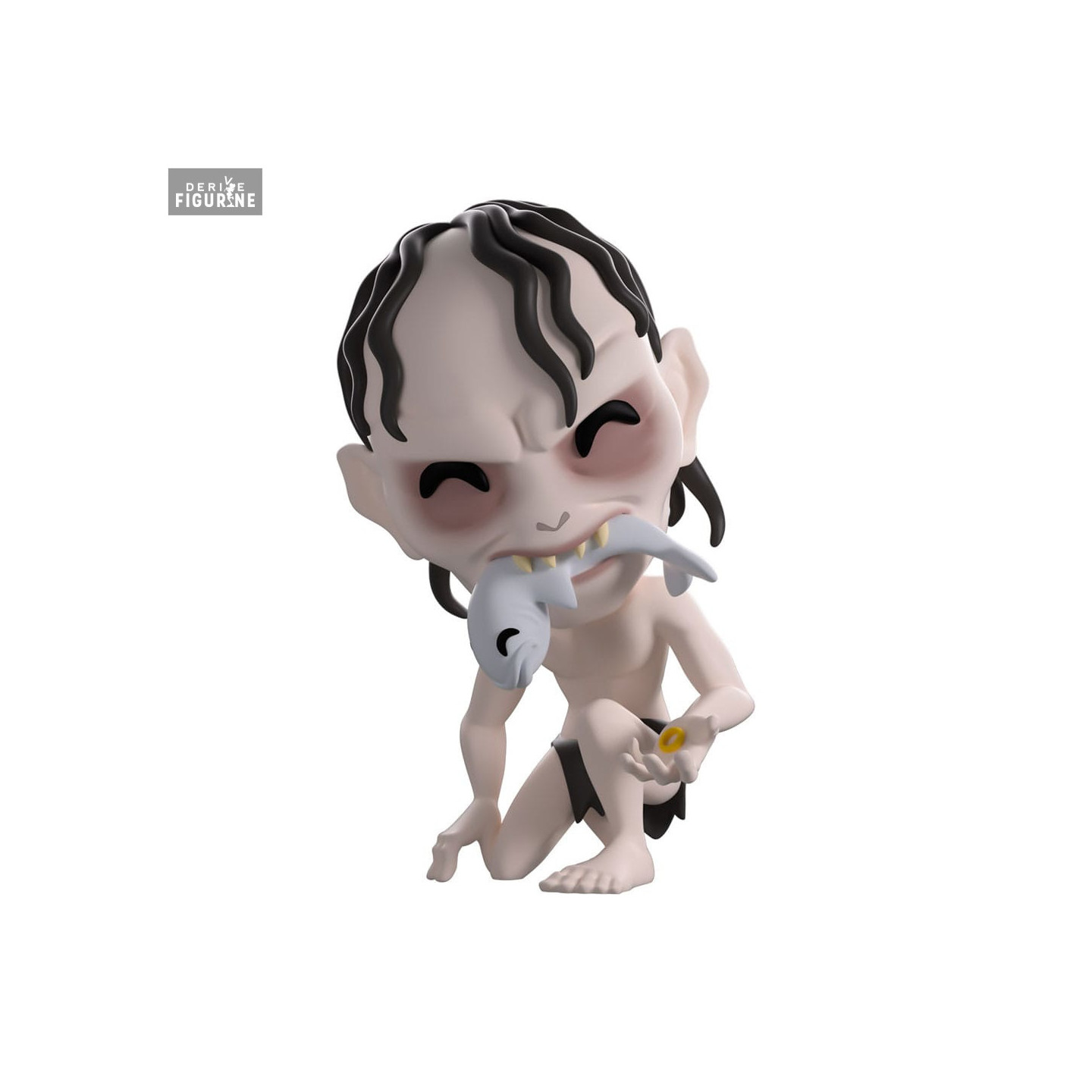 Check out this 10 cm vinyl figure: Gollum kneels, wild-eyed, with pale skin and purple-tinged circles under his eyes. A fresh fish dangles from his sharp teeth while he clasps a tiny golden ring in his hand. His tattered loincloth and straggly black hair are captured in a stylized yet faithful sculpt.