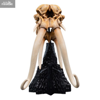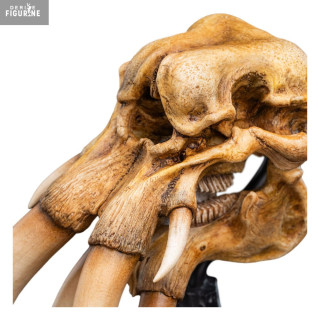Crafted from polystone, this model features a meticulous reproduction of the bone structure: split cranial arch, deep orbital-temporal cavities, and four lengthy, spiraled tusks rendered to scale. A sand-and-ivory patina enhances the aged look of the skull, while the matte black, rock-like sculpted base emulates a stone plinth.