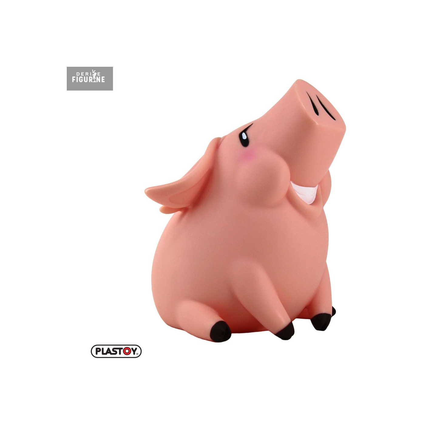The figure depicts him seated, head tilted upward with a wide smile revealing his white teeth. His smooth pink skin features a light blush on the cheeks. Small black hooves contrast with his rounded body. The elongated snout, with two black nostrils, and his floppy ears are faithfully captured.