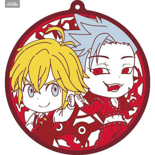 The Seven Deadly Sins official PVC keychain measures approximately 7,5 centimeters in diameter. The manufacturer is Banpresto. Contains only the Melody and Ban key ring on a red background.