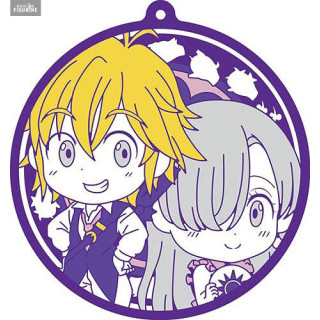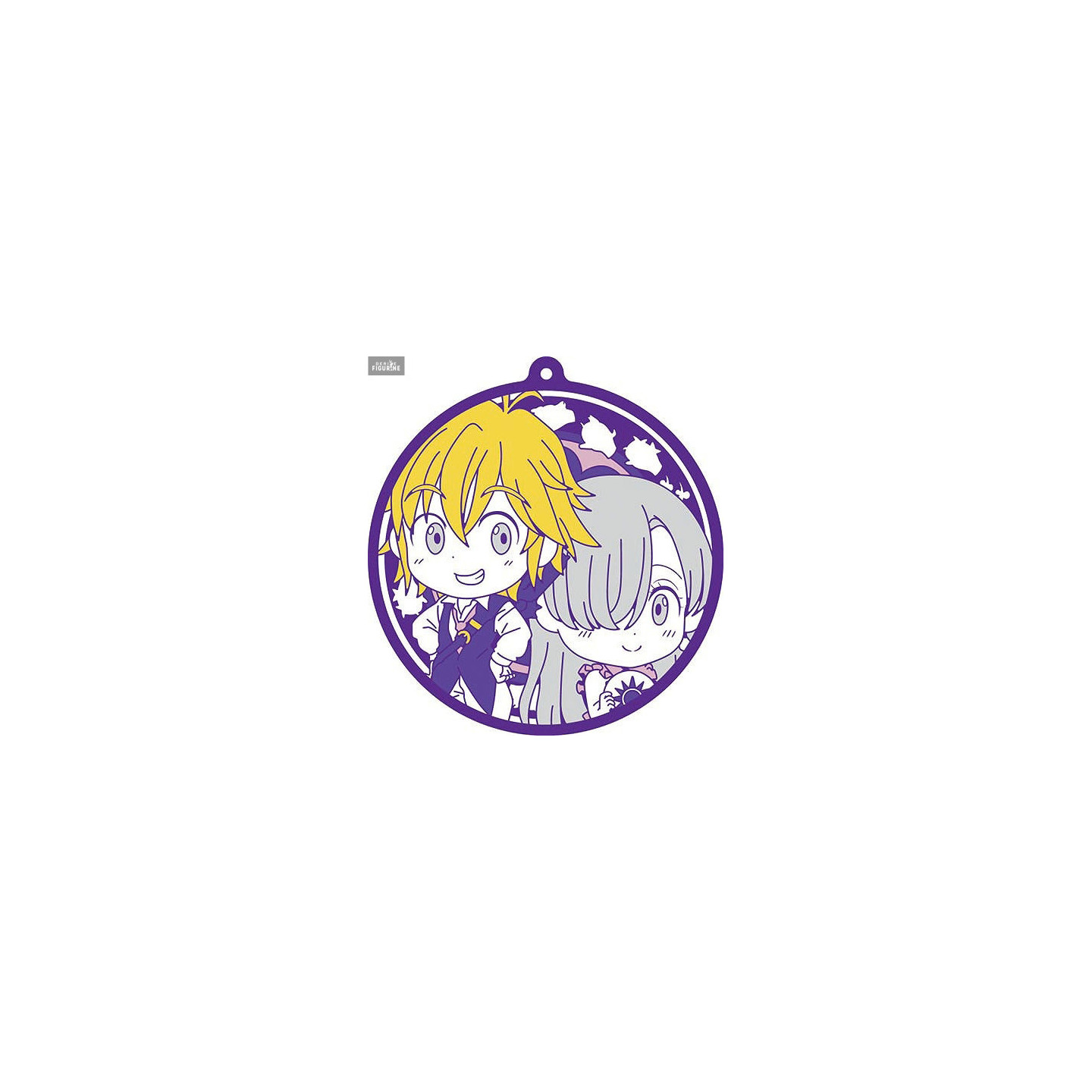 The Seven Deadly Sins official PVC keychain measures approximately 7,5 centimeters in diameter. The manufacturer is Banpresto. Contains only the Melodias and Elizabeth Liones key ring on a pruple background.