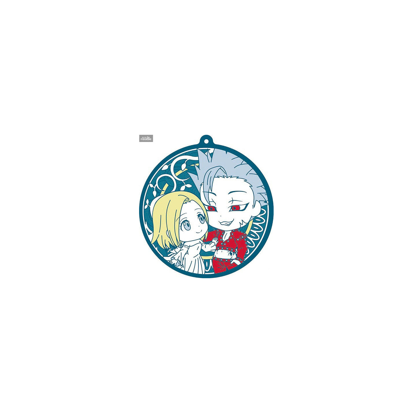 The Seven Deadly Sins official PVC keychain measures approximately 7,5 centimeters in diameter. The manufacturer is Banpresto. Contains only the Elaine and Ban key ring on a blue background.