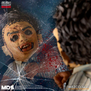 Official figure of Leatherface which measures approximately 15 centimeters high. It is from the Mezco Designer Series (MDS) collection. The manufacturer is Mezco Toys.