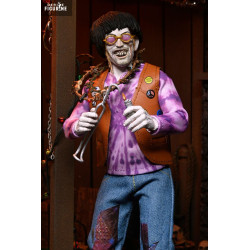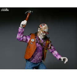 The figure features Chop Top’s signature psychedelic style: a purple tie-dye shirt, orange vest covered in pins, a tooth necklace, and tinted glasses. Accessories include his infamous hammer, hook, razor, lighter, and a removable wig — direct nods to his most disturbing moments on screen.