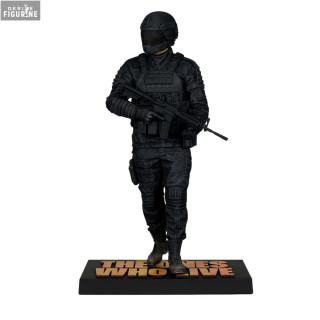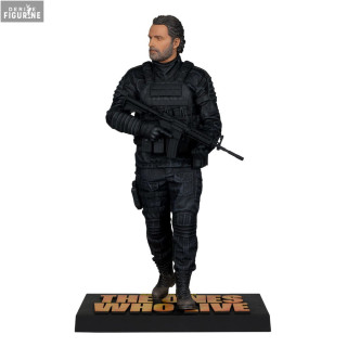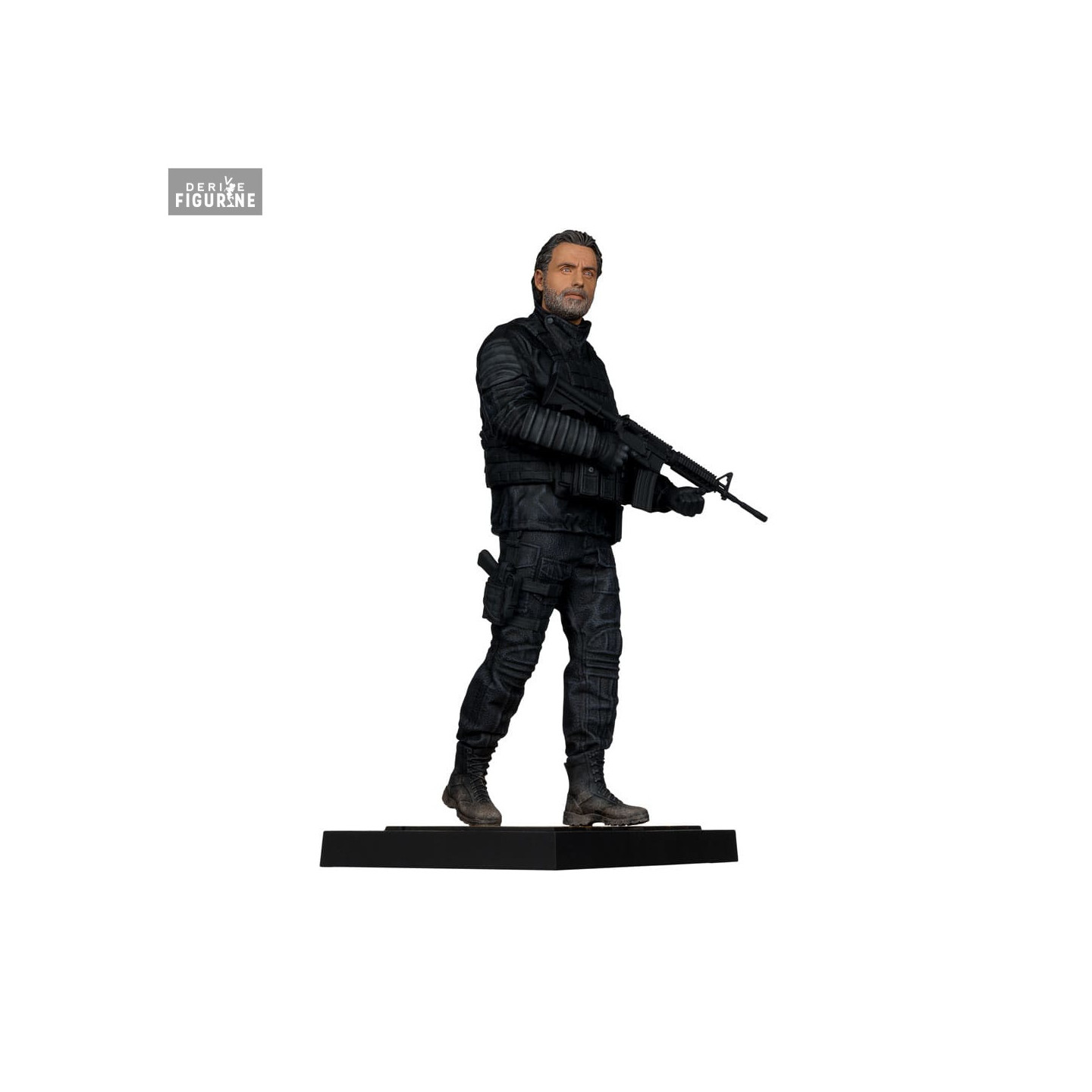 This Limited Edition official figure of Rick Grimes is crafted at 1/6 scale by McFarlane Toys and stands approximately 31 centimeters tall. The intricate detailing, from his black tactical gear to the realistic weapon accessories, demonstrates the exceptional craftsmanship of this collectible. With a commanding stance and rifle in hand, Rick exudes readiness and determination, making this figure a must-have for collectors and fans alike. The base, emblazoned with “The Ones Who Live,” completes this standout piece.