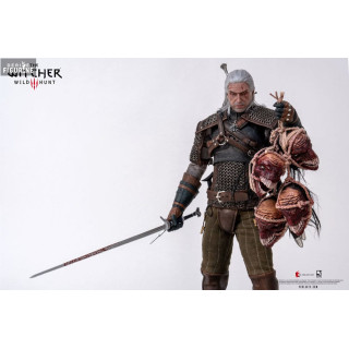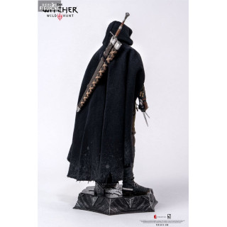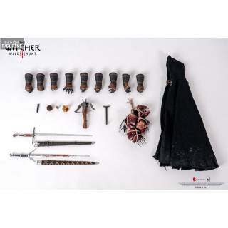 Geralt's outfit, his battle-worn hunter's armor, is faithfully reproduced with realistic textures and impressive finishes. The set includes a black fabric cloak to recreate scenes of him wandering through the icy lands of Skellige or the mysterious forests of Velen. Additionally, Geralt comes equipped with a full arsenal, including his iconic steel and silver swords (crafted in metal), a crossbow, and various accessories such as potions, monster trophies, and interchangeable hand pieces.