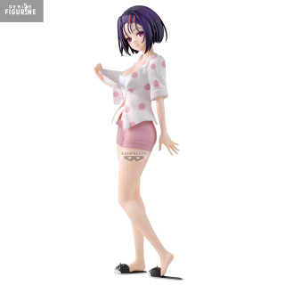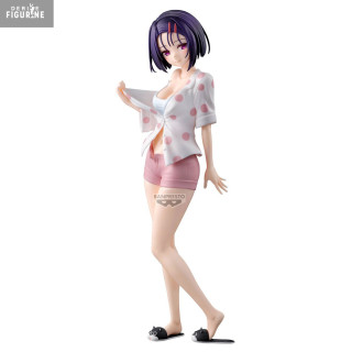 This 23 cm figure captures every detail of her loungewear: the open white polka-dot shirt over a form-fitting tank, coral shorts, and adorable cat slippers that hint at her innocent charm. Her sleek violet bob, accented by two red hairclips, falls gracefully on her shoulders, and her relaxed stance—a foot forward—adds a casual yet captivating touch.
