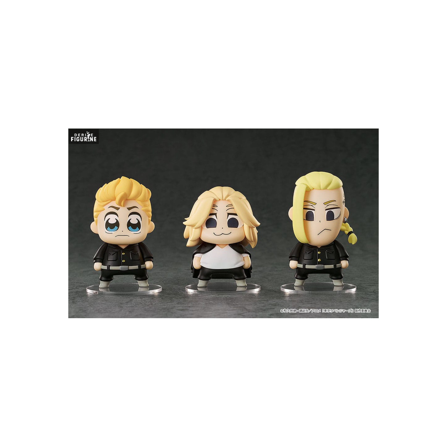 Official figures of Takemichi Hanagaki, Manjiro Sano, Ken Ryuguji in PVC which measure approximately 7 centimeters high. They are from the Chibi Bkub collection. The manufacturer is Good Smile Company.