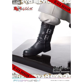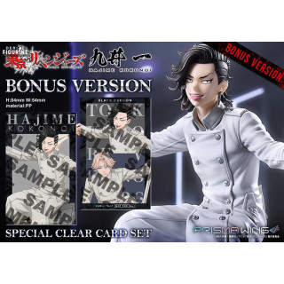 This Bonus Version includes a special clear card set featuring Hajime Kokonoi in various poses. The cards are 84 mm tall and 54 mm wide, made from PP material. This exclusive bonus adds a unique touch to the figure, making it ideal for collectors and Tokyo Revengers fans. The figure’s base also features the emblematic Black Dragons logo in relief, further enhancing its display value.