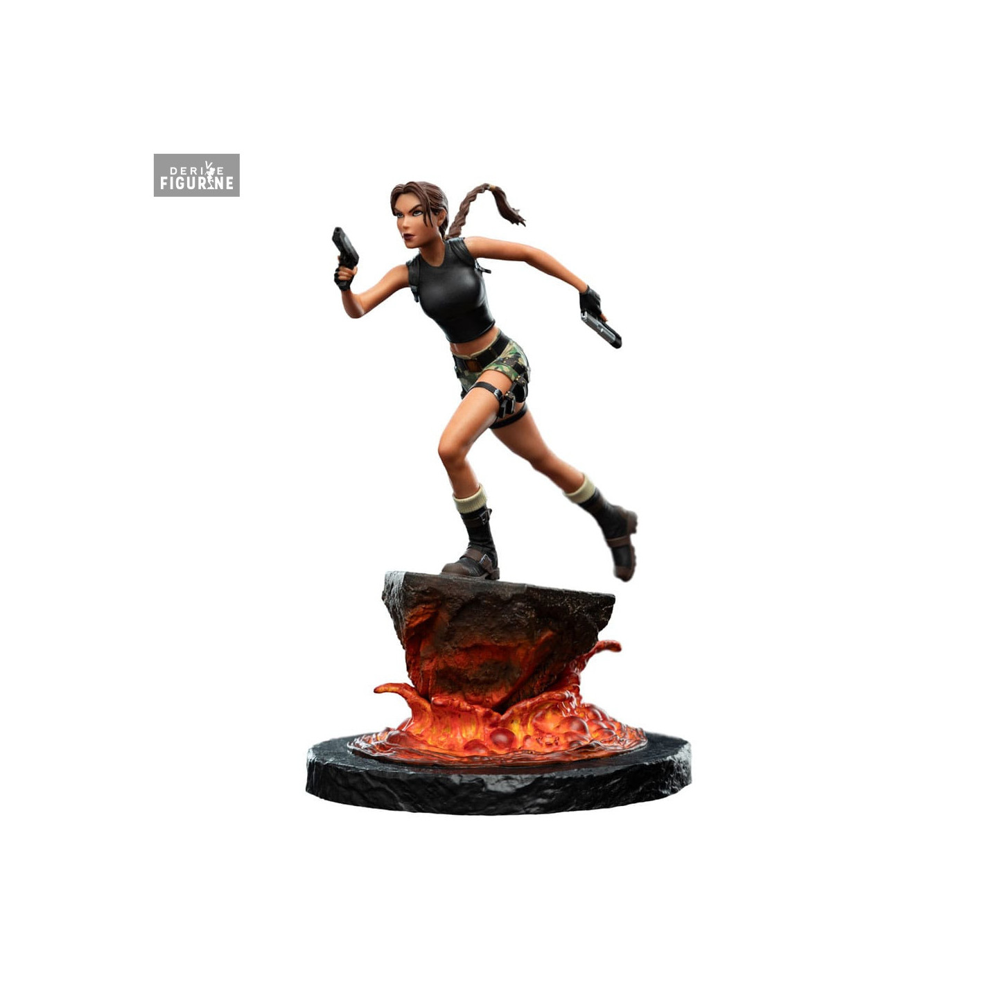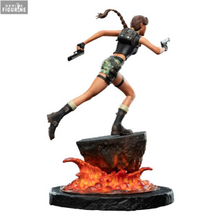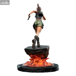 The figure depicts her mid-jump, pistols drawn and hair tied in a dynamic braid that follows her leap. Her camouflage shorts, black tank top, and adventurer boots are faithfully recreated, along with the lava-filled rocky base detailed with molten textures. Her focused and intense expression captures the energy of the moment perfectly.