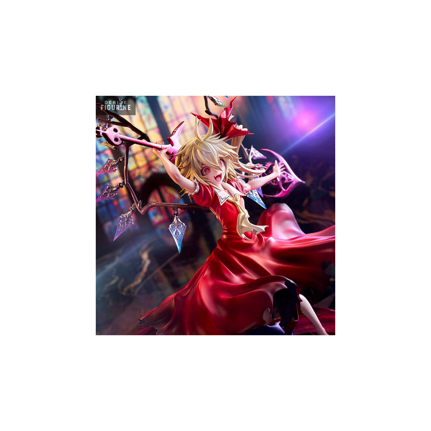Flandre Scarlet, with her mysterious air and impressive weapon, is captured in a pose that reflects all her strength and determination. The figure's intricately sculpted details add a realistic touch to his demonic face and elaborate clothing, creating a faithful representation of the iconic Touhou Project character.