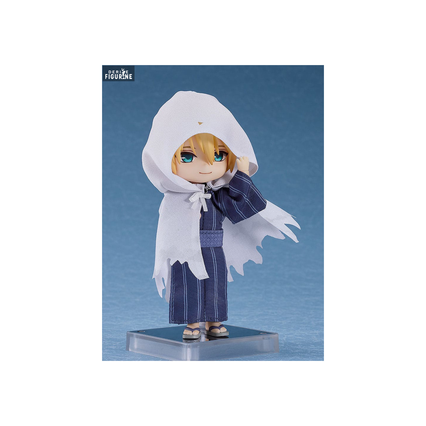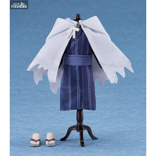 This "Casual Outfit" version features Yamanbagiri Kunihiro dressed in a blue striped kimono, paired with a matching traditional belt and a distressed white hooded cloak, emphasizing his humble yet mysterious character. The real fabric hood adds a touch of realism and sophistication, while his traditional sandals complete his relaxed yet refined look.