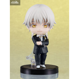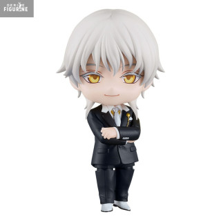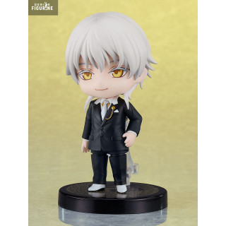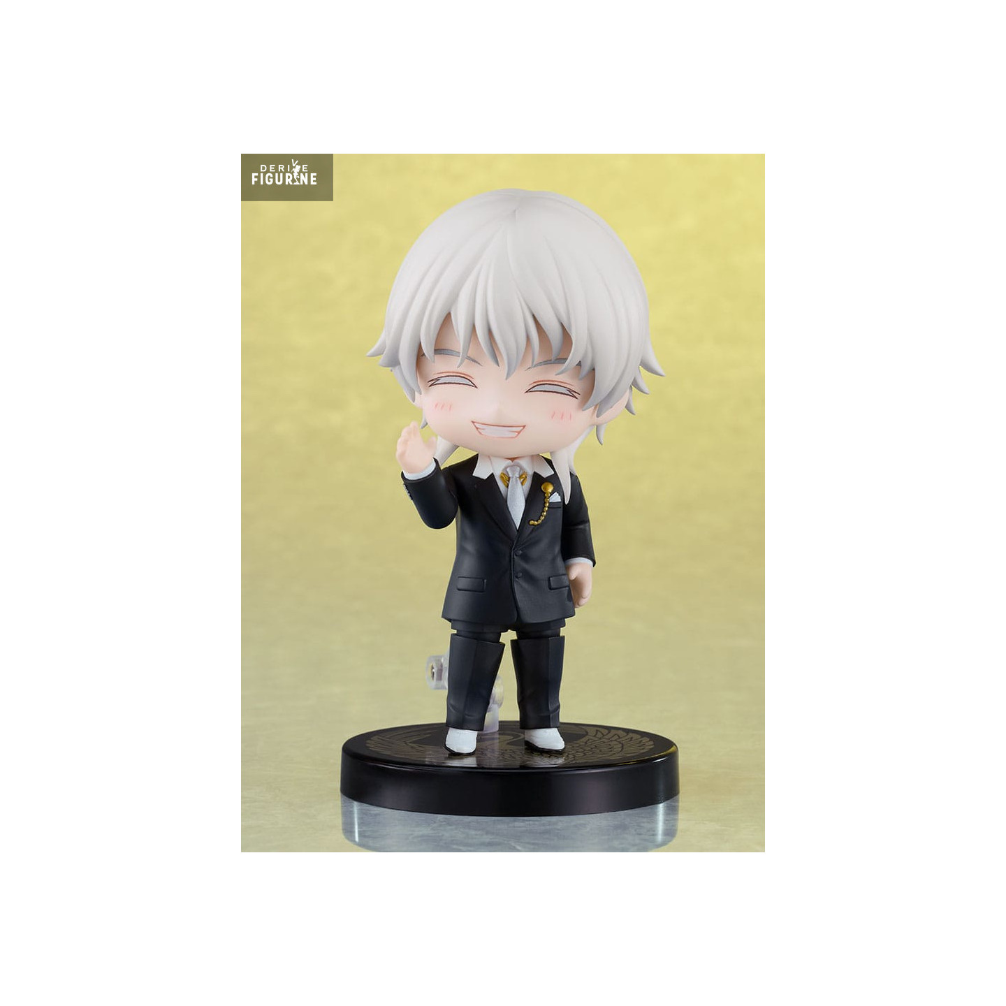 This Nendoroid faithfully recreates his ceremonial outfit: a perfectly tailored black three-piece suit accented by gold details like the finely engraved watch chain and buttons. His silver hair cascades in silky strands over his shoulders, framing a face with amber eyes and softly arched brows. Two expressive faceplates—calm gaze and winking grin—capture the full spectrum of his personality.