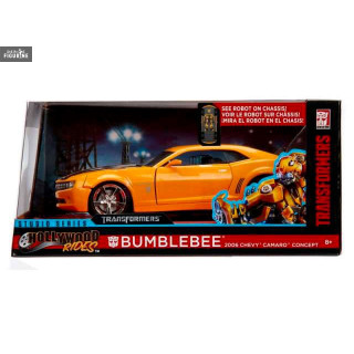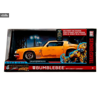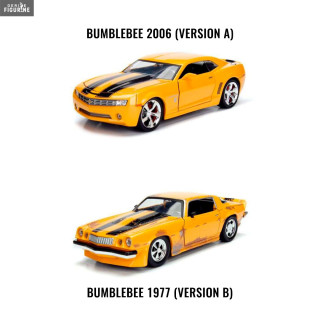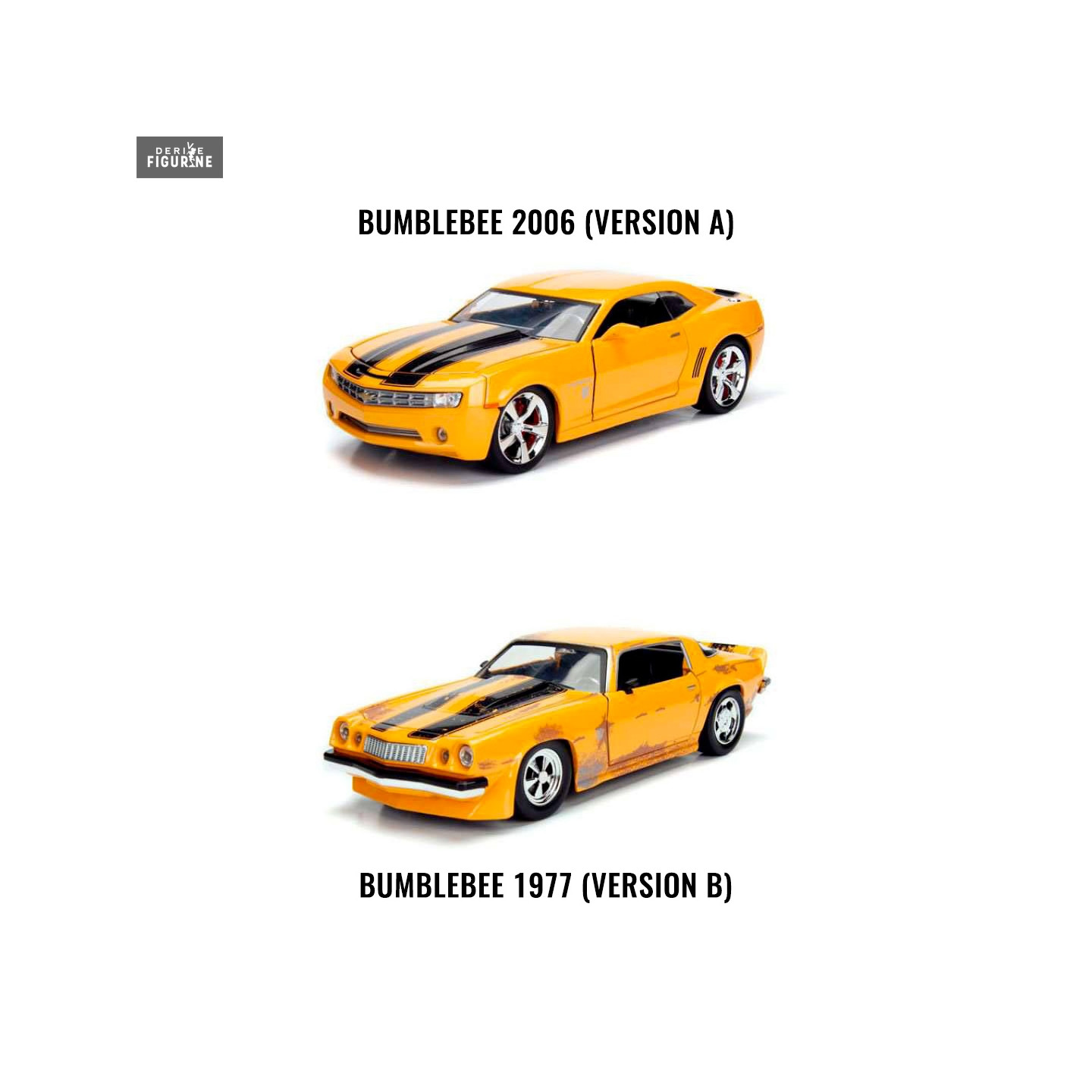 Official Chevrolet Camaro Bumblebee of your choice, 2006 (version A) or 1977 (version B) replica in metal Die Cast and injected plastic, scale 1/24. The manufacturer is Jada Toys.