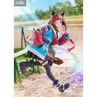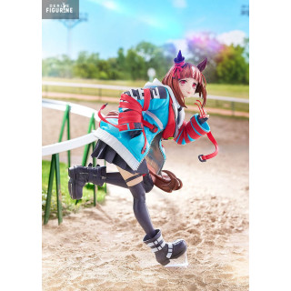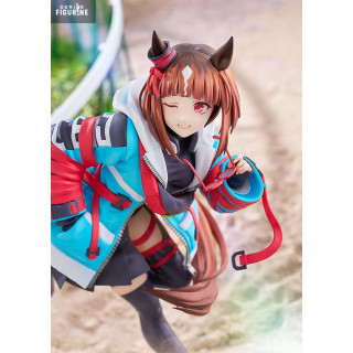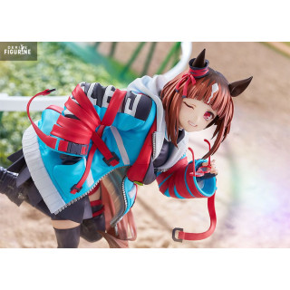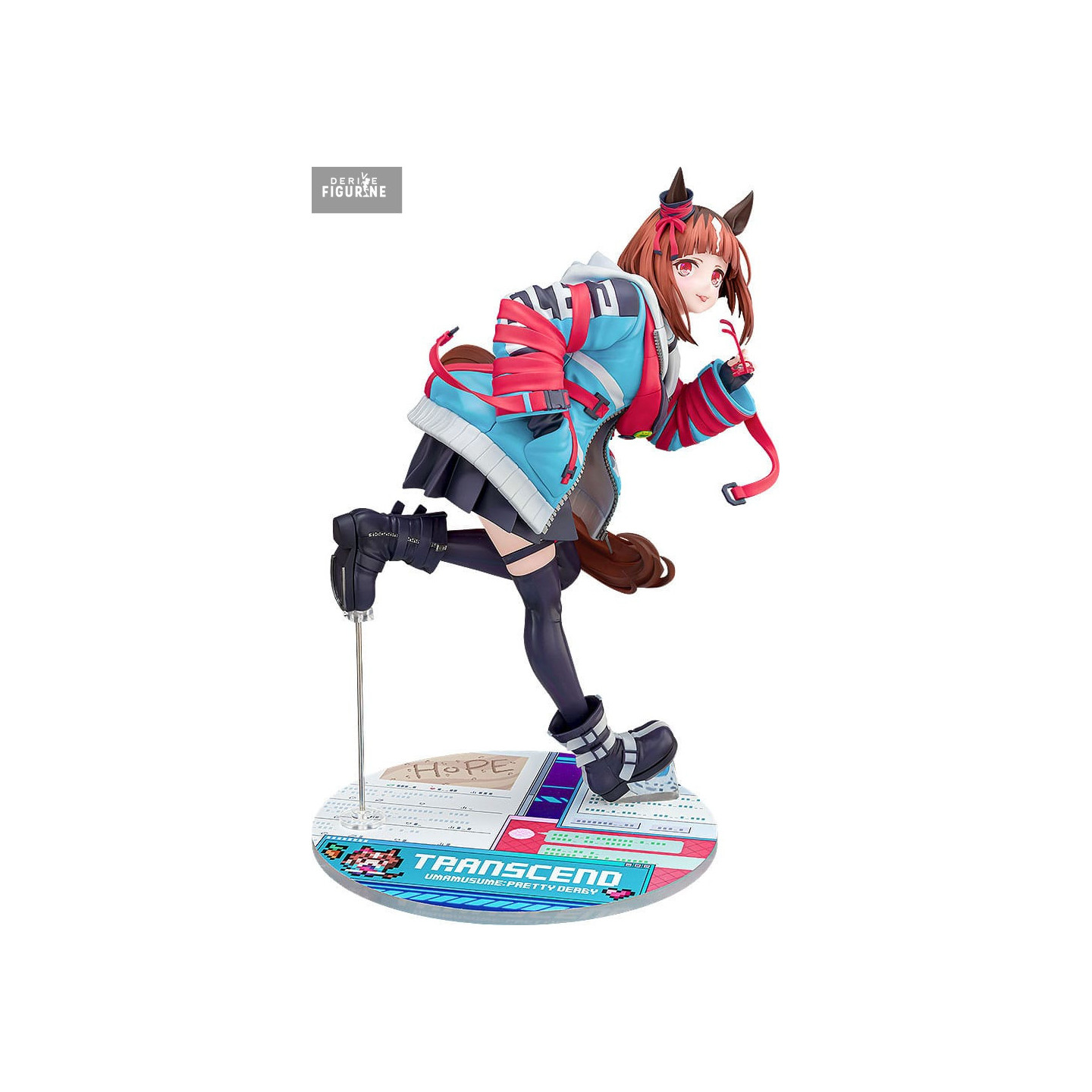 Standing about 24 cm tall, she’s captured mid-run, decked out in a vibrant blue and red jacket, skirt, and chunky high-tops. But the Uma Musume DNA is still there—horse ears, a flowing tail, and the unmissable energy of a girl chasing her goal. The base mimics a digital ID card, with “HOPE” scrawled across it, tying back to the theme of chasing dreams.