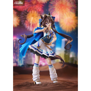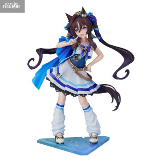 The figure captures her lively look with precision: a colorful idol dress in shades of blue, white, and purple, highlighted by a large ribbon on her back. Her long wavy hair, layered bangs, and horse ears enhance her expressive silhouette. Details like the golden belt, tiara, and stage-ready accessories bring her design to life. Her dynamic pose and confident smile radiate natural charisma.