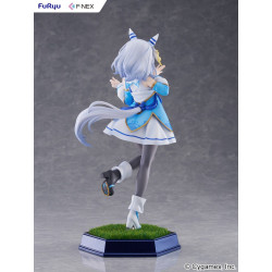 Visually, she’s sculpted in a lively one-leg stance, the other leg lifted behind, with both hands extended in a welcoming gesture. She has light grey bob-cut hair, horse ears with blue and white details, and a long matching tail flowing behind. Her outfit is mostly blue and white: a short flared dress, a top with blue edging and small gold accents, and a large blue bow at the waist. She wears dark grey tights and blue/black shoes, finished with fluffy white ankle cuffs. Everything sits on a base with a grassy top, set into a blue platform with a small nameplate on the front.