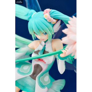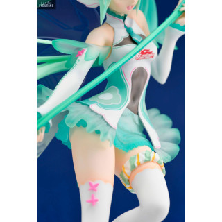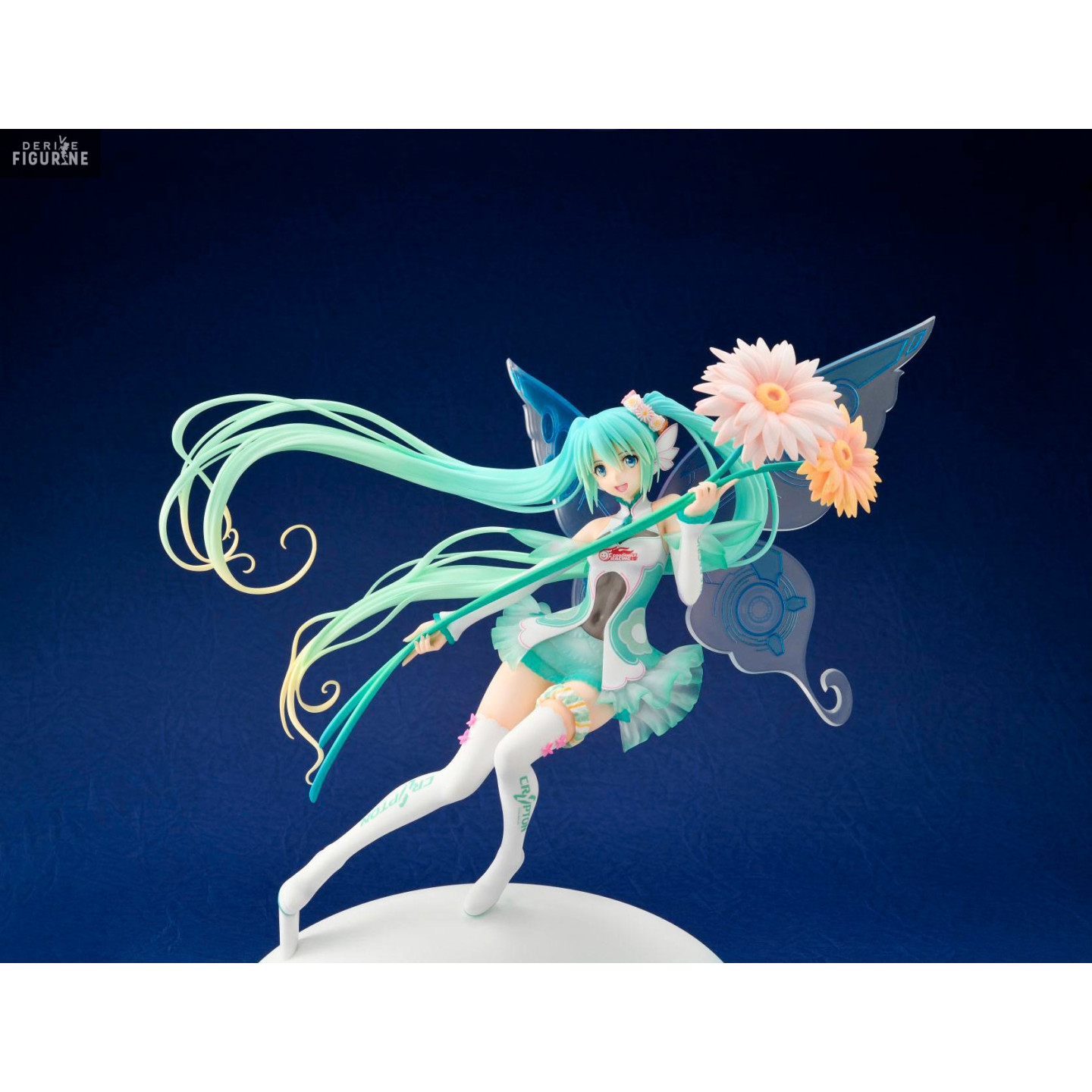 You recognized Miku Hatsune and here she is in a Racing version. She looks like a fairy with her wings and she holds two flowers in her hands. On her outfit, we can see the sponsors who support her to know Crypton and GoodSmile Racing.