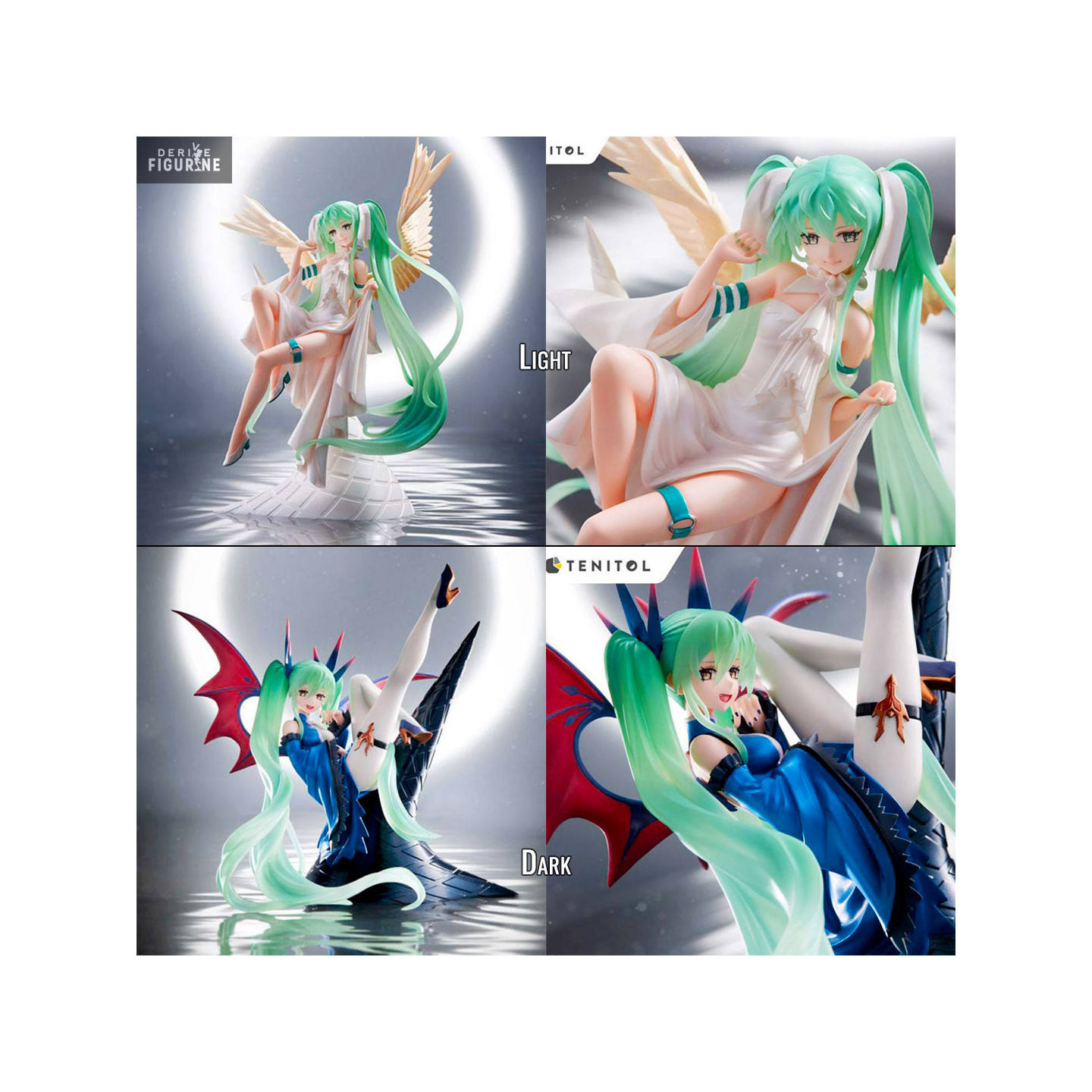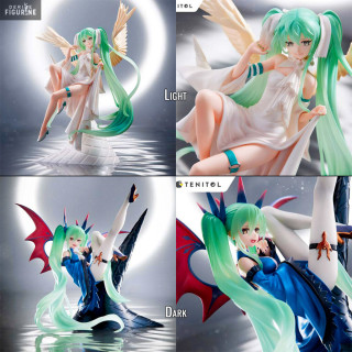 Here are two magnificent versions of Hatsune Miku, Light or Dark, the choice is yours! Find the Light version with her big smile and her magnificent angel wings. Accompanied by a large white dress and headbands in the hair that highlight its large pigtails. Or the Dark version and its dark side with wings and a midnight blue dress with large white tights. Her pose is reminiscent of that of the villains in anime. Both will complete your most beautiful collection!