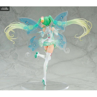 Here is the pretty Miku Hatsune in a green and white outfit. She is ready to support her team with her butterfly wings and the flowers in her hair. In addition, she makes the V of victory with her fingers.