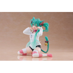 Hatsune Miku is the iconic virtual singer from the Vocaloid world, instantly recognizable thanks to her long turquoise twin-tails and the endless variety of styles she appears in. This time, the vibe is much more casual and cute, built around a cat-ear theme rather than a stage costume. This official Cat Ear T-Shirt PVC figure stands at about 13 cm, comes from the Desktop Cute line, and is manufactured by Taito, designed to sit nicely on a desk or shelf.