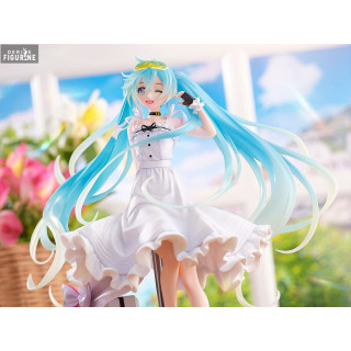 The figure features Hatsune Miku in a casual summer outfit, ready for a sunny vacation. She wears a light white dress, decorated with delicate ruffles, which brings a touch of freshness and femininity. The dress, flowing and detailed, pairs perfectly with her pink heeled sandals, adding a pop of bright color to the whole look. Her look is completed by stylish sunglasses, placed on her head, and a bright smile that reflects her jovial mood.