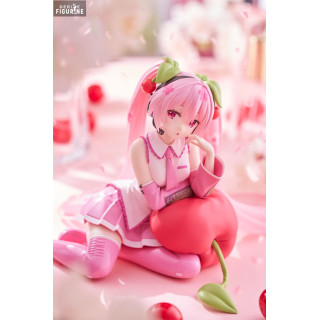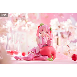 In this figure, Sakura Miku sits gracefully on a cherry-shaped cushion in a contemplative pose that invites serenity. Her outfit, in soft pastel tones of pink and white, is adorned with subtle details reminiscent of cherry blossom petals. Her long, translucent pink hair with luminous highlights adds a dreamlike touch to the overall aesthetic. The careful craftsmanship, including the intricate design of her microphone and the textures of her outfit, captures all the tenderness and delicacy of this character.