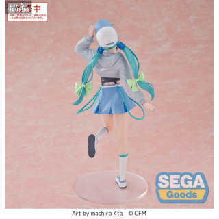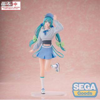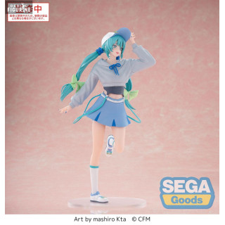 This figure of Hatsune Miku belongs to the Luminasta Conceptual Series Vol.2, which features conceptual, fashion-inspired designs. This version presents Miku in a playful and modern urban outfit. She wears a light gray crop-top with long sleeves and a bow at the neckline, paired with a pleated pastel blue mini skirt. Her signature twin-tails are adorned with light green ribbons, and a blue cap gives her a laid-back, charming vibe. Captured mid-pose with one leg up and a cheerful expression, this figure embodies her dynamic and joyful energy.