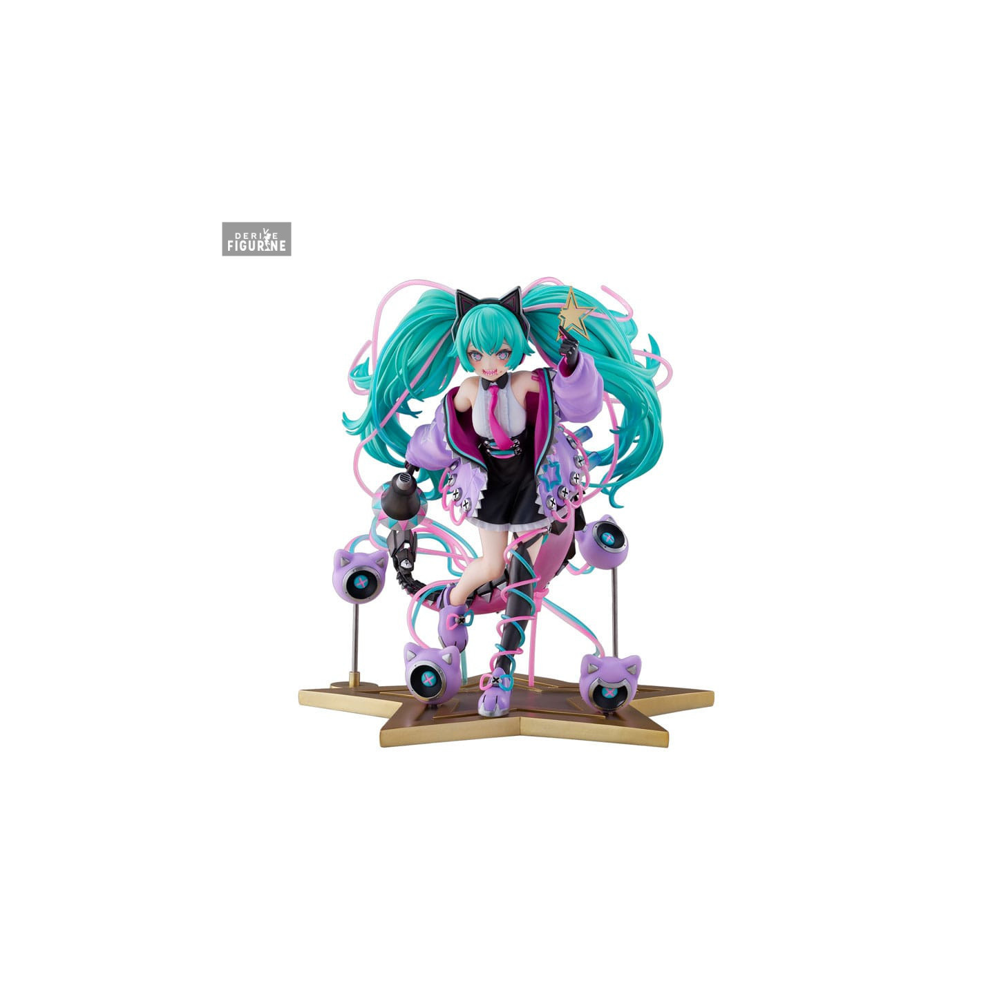 She’s rocking a bold, street-style outfit: oversized purple jacket, mini skirt, high lace-up boots, and of course those signature turquoise twin-tails swirling around her. Fun detail: her tech accessories like the mic arm and cat-shaped speakers add that playful, futuristic vibe we all love. You can just feel she’s ready to light up the stage again, with her cheeky smile and confident stance.