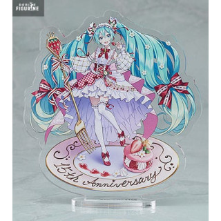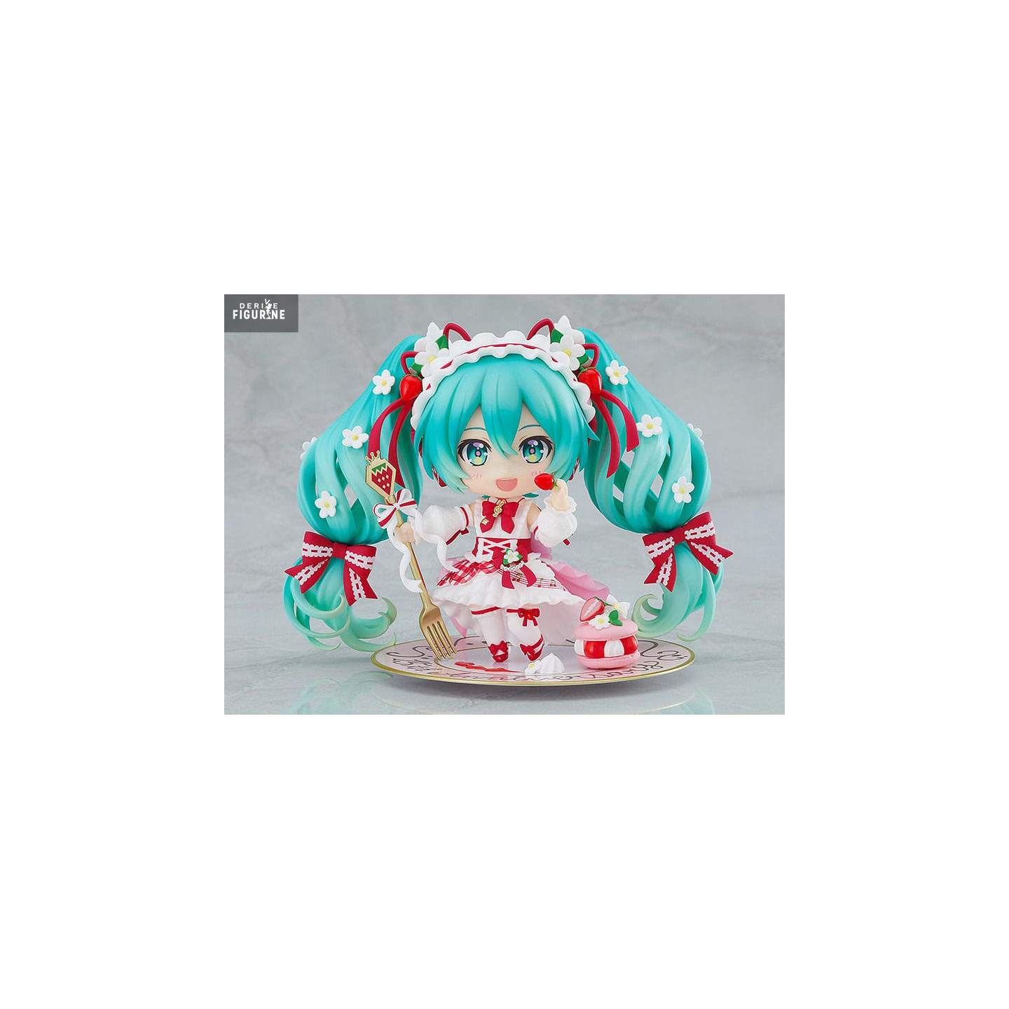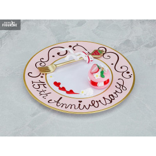 The figure recreates the outfit from the official anniversary illustration: a dessert-themed costume blending sugary sweetness with festive elegance. Miku is posed cheerfully, holding a golden fork and a strawberry, perfectly matching the fairytale vibe of the original artwork—also included as a decorative acrylic panel.