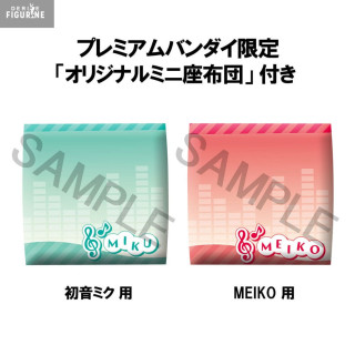 The set also includes two mini cushions in each character’s signature colors and logo: turquoise for Miku and reddish-pink for Meiko, adding an extra touch of personalization and display charm.