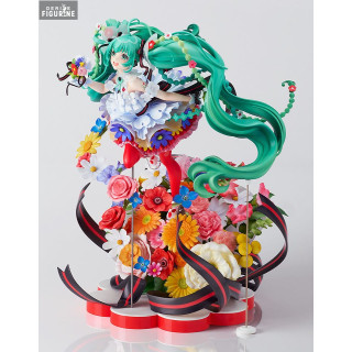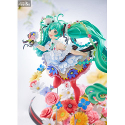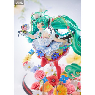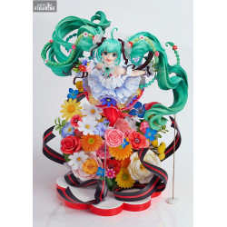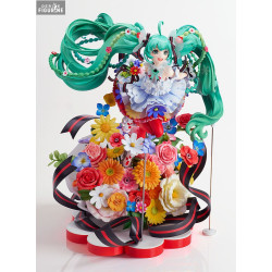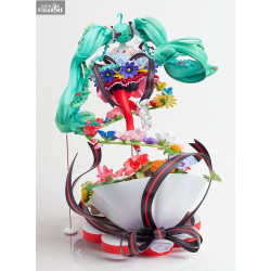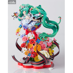 The figure’s design stays true to the image provided, offering a composition rich in visual detail: a variety of floral textures, soft gradients on the dress, and intricate hair accessories. The sculpt captures dynamic motion through Miku’s floating pose and the elegant flow of her hair. The flower-shaped base doubles as a concert stage, heightening the sense of lightness and spectacle.