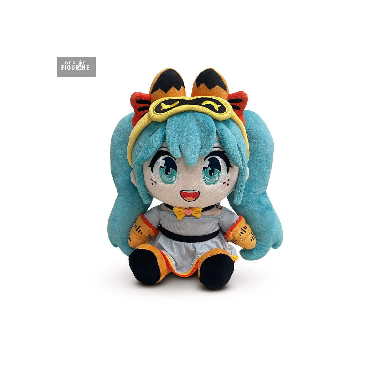 Hatsune Miku, the world-famous virtual icon, returns in an adorable plush version, this time inspired by a feline-themed design. With her signature turquoise hair and sparkling expression, Miku wears a unique outfit with tiger-like accents. Her black and white outfit features orange details reminiscent of tiger stripes, and she sports a headband adorned with feline ears, adding a playful touch to her appearance. This exclusive version perfectly captures the lively and dynamic personality of the virtual superstar.